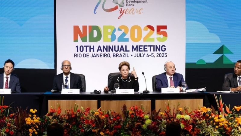 by Dennis Small (EIRNS) — Jul. 05, 2025 EST - The president of the New Development Bank (NDB), formed by members of the BRICS, Dilma Rousseff, speaks to the press with the board of directors during the 10th Annual Meeting, in Copacabana. Photo: Fernando Frazão/Agência Brasil