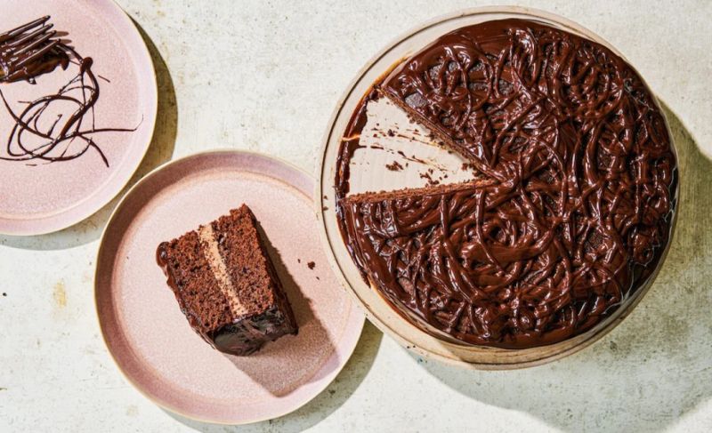 Spread the buttercream on one layer of cake – use a spatula or a palette knife – then put the other layer on top. Using a clean spatula or palette knife, spread the chocolate glaze on top of this layer (or drizzle it over) and encourage it down the sides of the cake. Neaten it all the way round with the palette knife. Leave to set a little before serving.