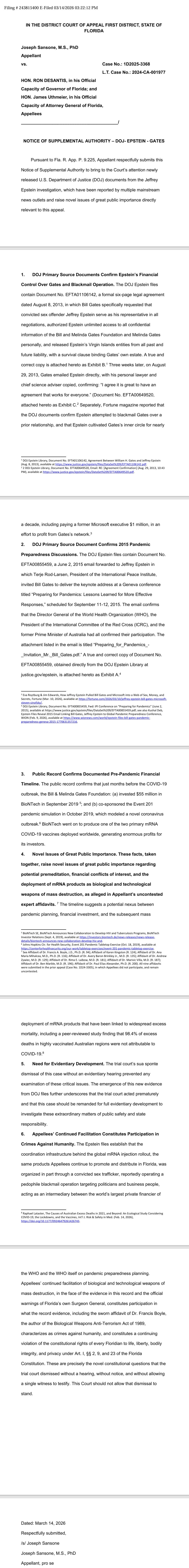For Immediate Release - Bonita Springs Florida - Psychotherapist, Dr. Joseph Sansone, filed DOJ Bill Gates Epstein File material as a Supplemental Authority in the Sansone V. DeSantis and Uthmeir, mRNA Bioweapons Case.
