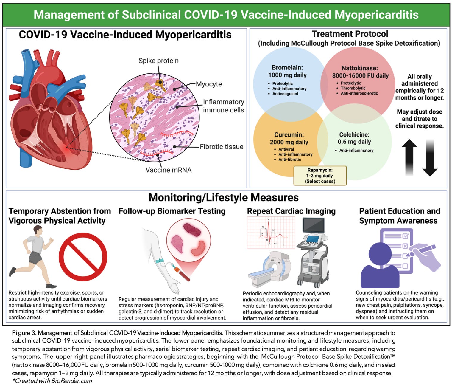 Our paper outlines the first structured clinical management pathway for subclinical myopericarditis following COVID-19 mRNA vaccination. This framework — summarized in Figure 3 of the publication — integrates lifestyle precautions, biomarker surveillance, imaging follow-up, and targeted pharmacologic intervention.