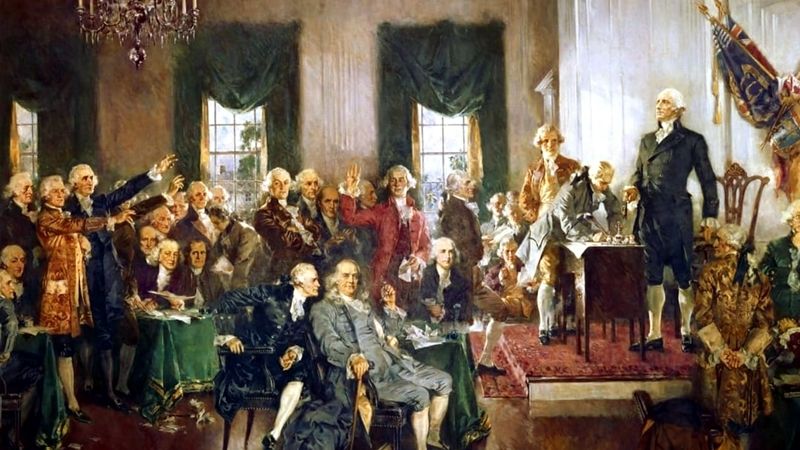 by Jason Ross (EIRNS) — Jul. 04, 2025 EST - The September 17, 1787 signing of the U.S. Constitution. Benjamin Franklin, seated, is in the center. George Washington stands on the right, the “rising sun” chair behind him.