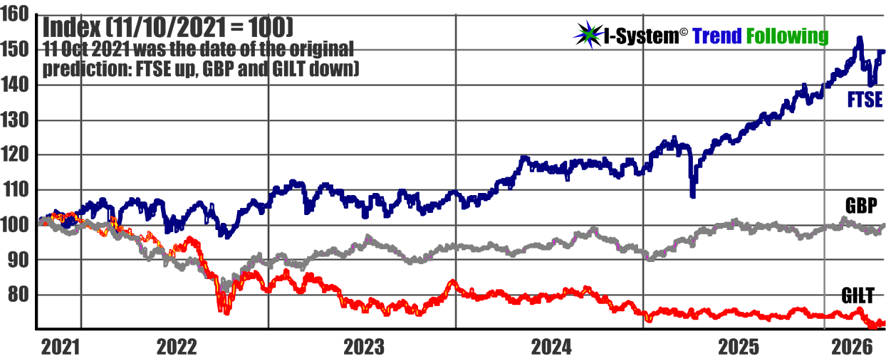 I published this prediction on 11 October 2021. The following chart indexes British government bonds (gilts), British pound and FTSE 100 equity index: