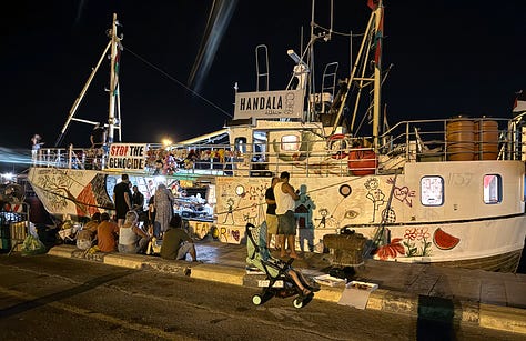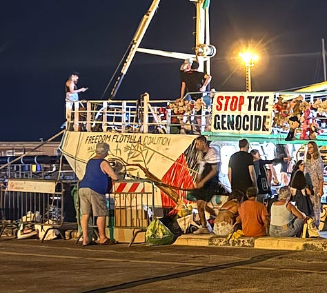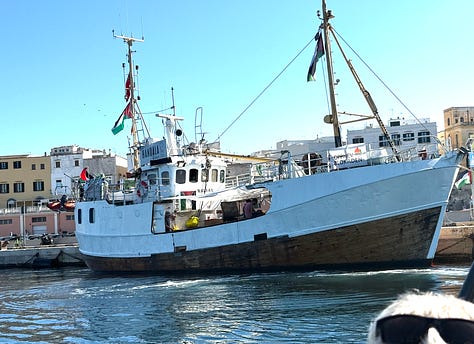 While we were in Gallipoli, Italy, the boat operated by the Freedom Flotilla Coalition (FFC) was docked. This is the boat Greta tried to go to Gaza in, twice. Note the middle photo - this is what the ship looks like on the starboard side. People were lining up all day to ogle and, obviously, donate. Again, a psyops- a photo opportunity.