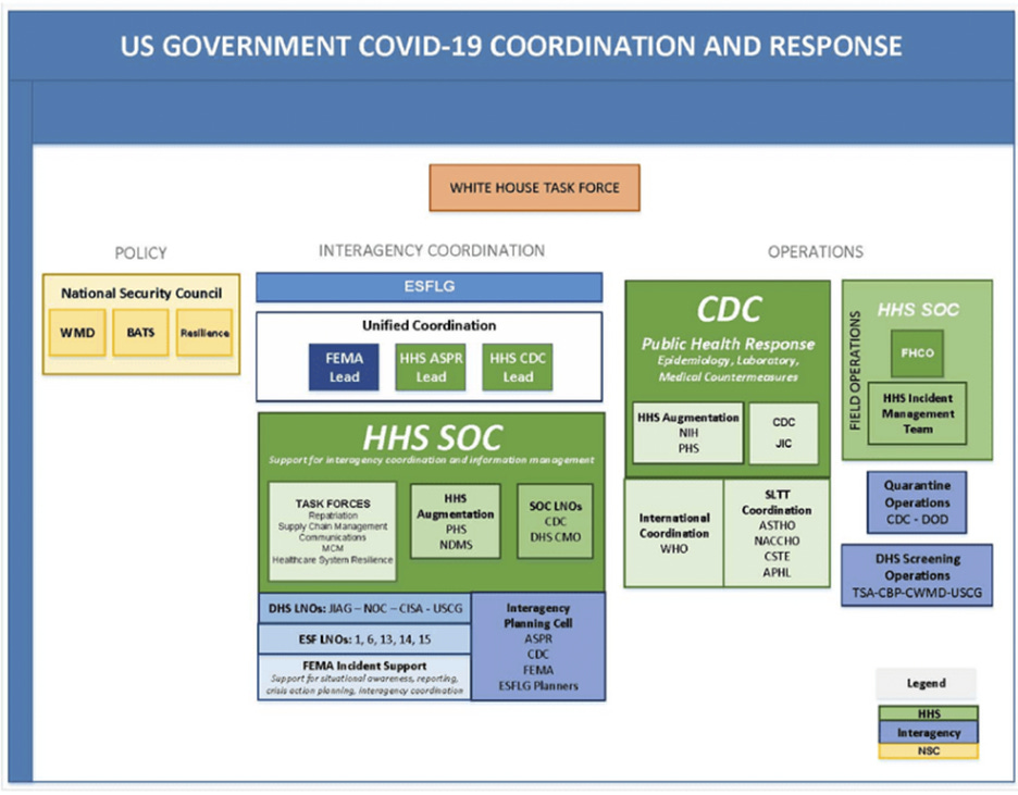 In the US, March 13, 2020: “PanCAP Adapted U.S. Government COVID-19 Response Plan” (PanCAP-A) states that United States policy in response to SARS-CoV-2 is set not by the public health agencies designated in pandemic preparedness protocols (Pandemic and All Hazards Preparedness Act,[30] PPD-44,[31] BIA), but rather by the National Security Council, or NSC. NSC does not have regular attendees from public health agencies and its focus is national security and foreign policy matters.”