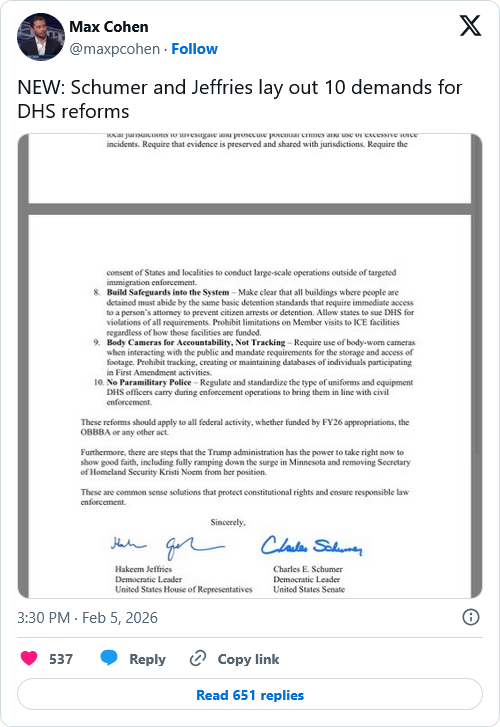 In a letter to GOP leadership, they demanded a slate of “reforms” to immigration enforcement as the price for funding the Department of Homeland Security, including targeted enforcement, no masks, mandatory use of body cameras, and other demands, several of which I suspect are nonstarters.