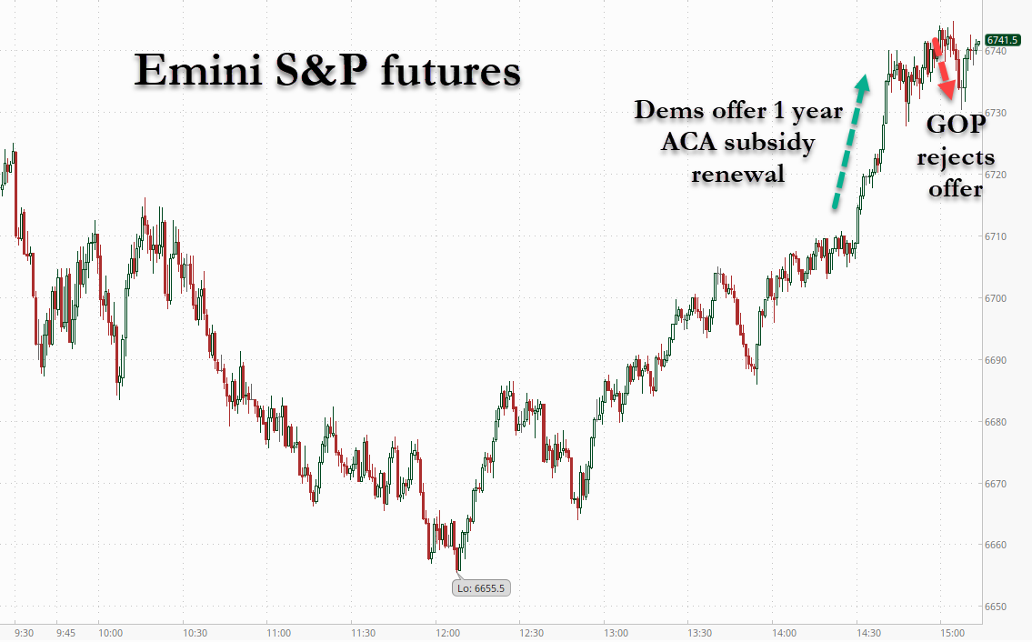 Update (1440ET): It appears we may be close to a resolution to reopen the government - as Senate Minority Leader Chuck Schumer is reportedly about to make an offer: Extend Obamacare enhanced subsidies for one year in exchange for their votes, according to Punchbowl News' Max Cohen.