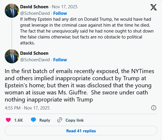 In a Sunday post on 𝕏, Schoen made it clear that if Epstein had anything to use against Trump, he would have weaponized it long before his death.
