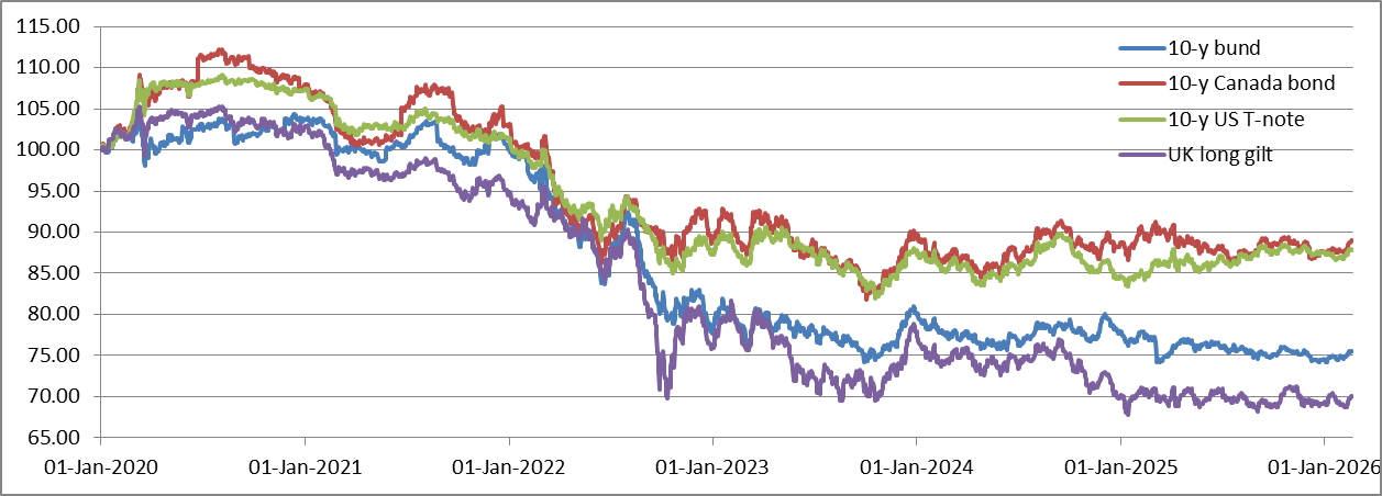 The trends are obviously quite dismal and only getting worse. While new business registrations are basically flatlining, bankruptcies are soaring. That’s Europe’s tax base falling off a cliff taking jobs along with it. And even if the markets aren’t registering these trends in the near term, it’s clear that on the longer horizon, the weakness of European economies is showing. The chart below shows the price of the U.S., Canada’s, Britain’s and Germany’s 10-year government bonds:
