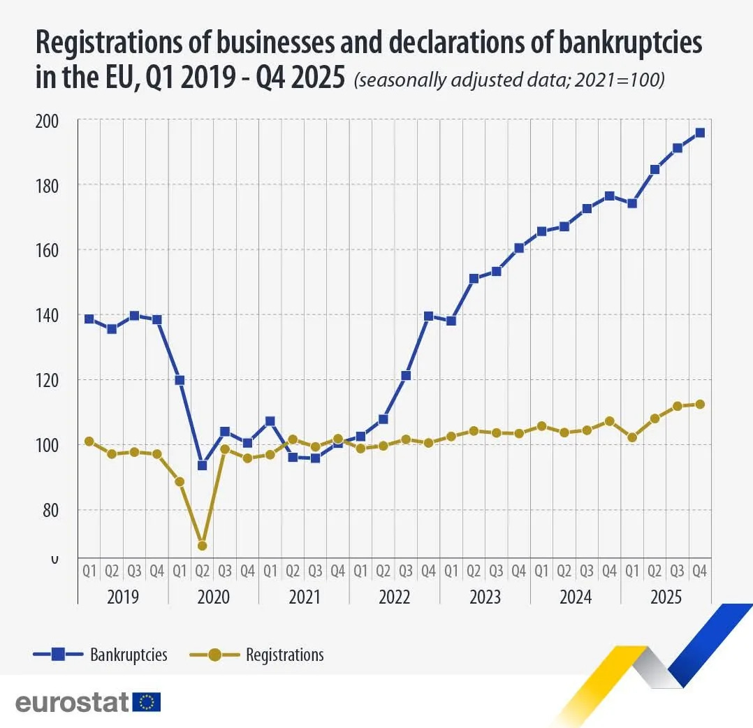 The fact that Europe’s economy is in a structural decline is not news. The following chart tells the story in two important aggregates: the number of companies going out of business vs. the number of new companies being formed: