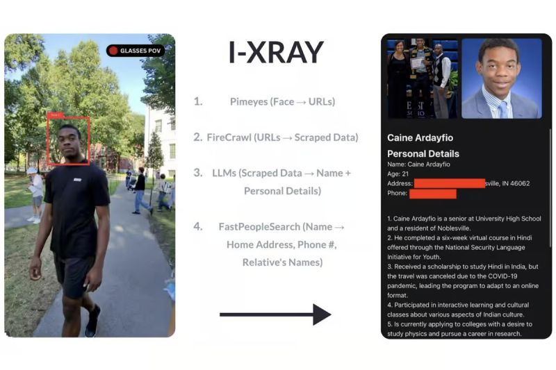 AnhPhu Nguyen, a junior at Harvard University, uses the livestreaming feature of his Meta Ray-Ban 2 smart glasses while a connected computer monitors the feed in real-time. He employs publicly available AI-powered facial recognition software to detect faces and scour the internet for more images of those individuals.