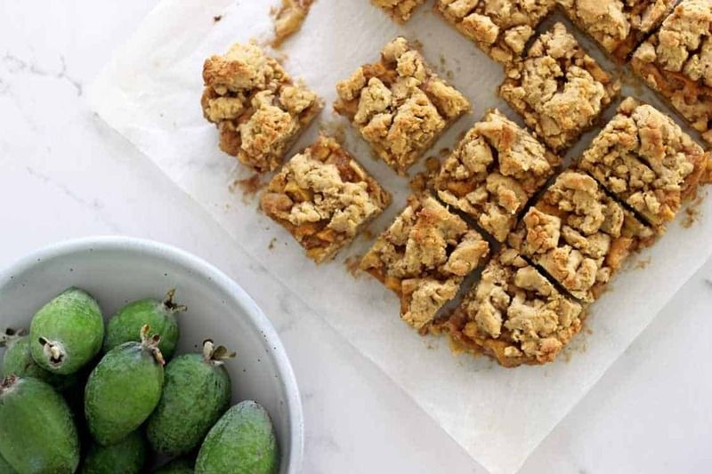 This Feijoa Crumble Slice is the perfect way to celebrate feijoa season! It's a quick easy slice with an oaty base, feijoa filling and a crumble topping that's perfect served as a warm dessert or as a lunchbox snack!