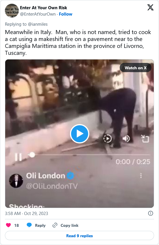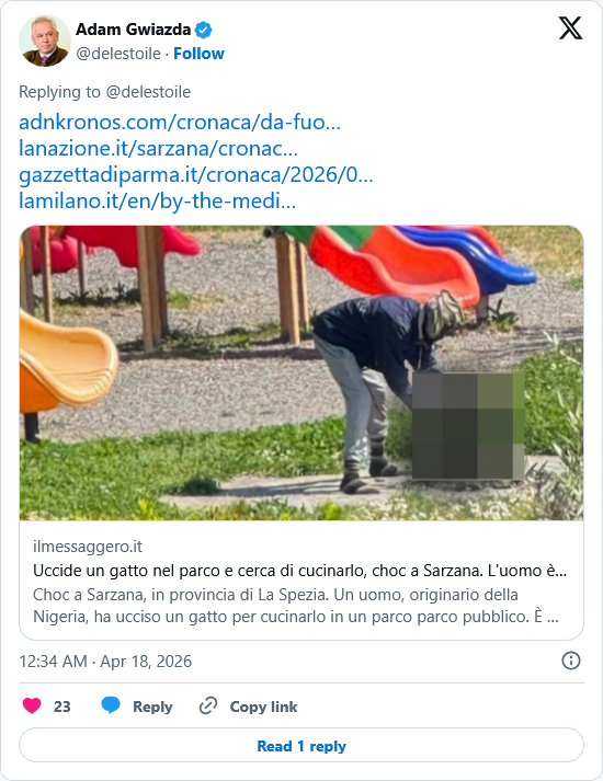 A Nigerian immigrant was arrested in Sarzana, Italy after local residents spotted him roasting a freshly killed cat on a makeshift barbecue in a Park—right beside a children’s playground.