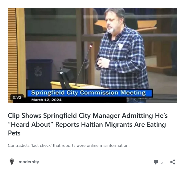 A city commission meeting heard residents testify to the practice, and a clip later surfaced showing the city manager admitting he had “heard about” the reports of Haitian migrants eating pets—despite frantic media efforts to dismiss the claims as baseless.