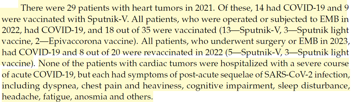 A 1.5-fold increase in the number of heart tumors by 2023 was observed, with a statistically significant increase in the number of myxomas. There was no correlation with vaccination (Sputnik V, Sputnik Light, and Epivaccorona), and no significant differences were found between patients from 2016-2019 and 2021-2023 in terms of gender, age, and cardiac rhythm disorders. Morphological examination revealed the expression of spike SARS-CoV-2 in tumor cells, endothelial cells, and macrophages in 10 out of 11 heart tumors.
