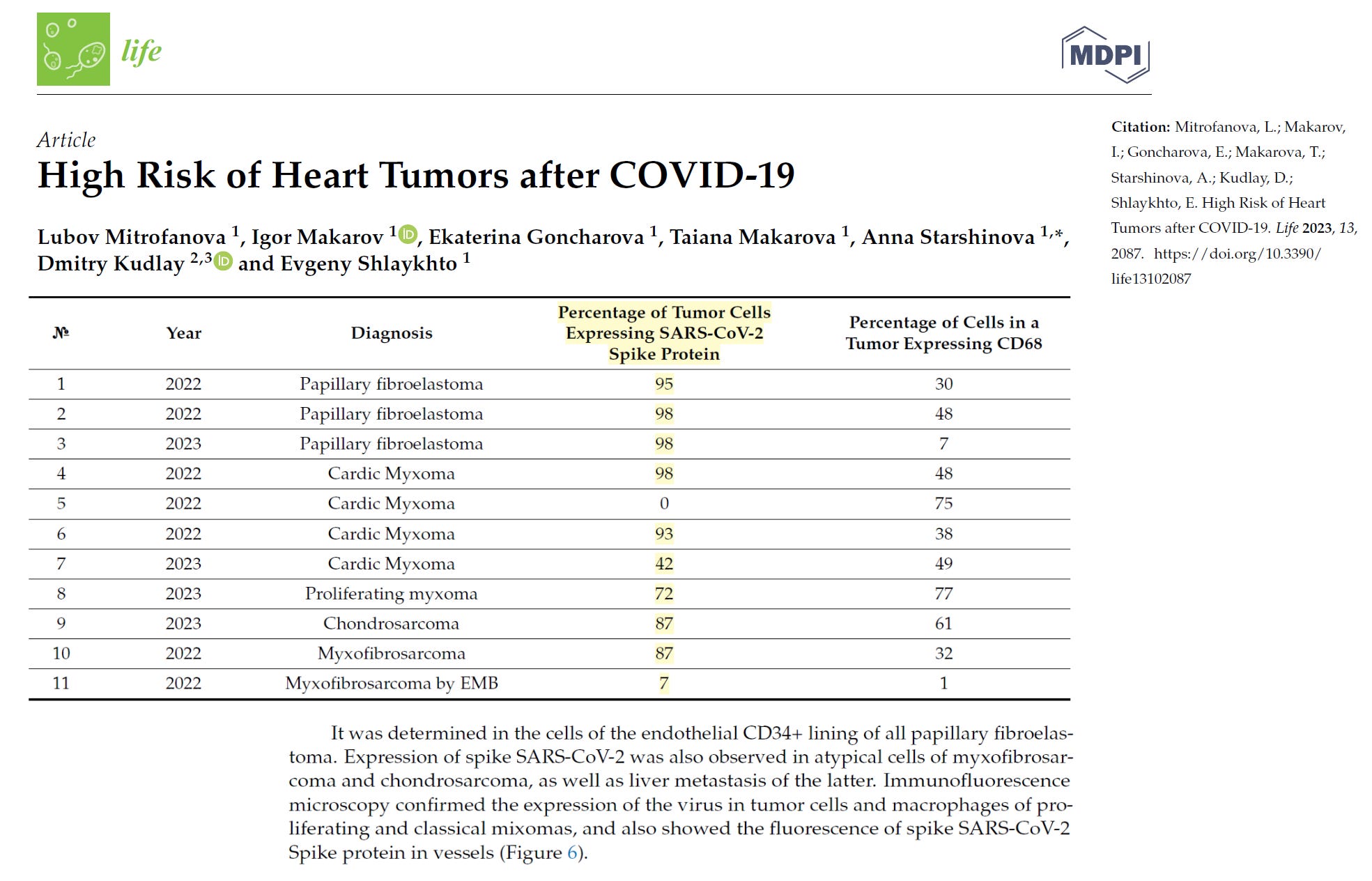An infant in my family circle developed an unusual cardiac fibroid tumor in the left ventricle requiring urgent surgery in 2024. The histology was bizarre with mixed fibrotic and neoplastic changes. I urged for tissue staining of the tumor for SARS-CoV-2 Spike protein as well as qPCR for COVID-19 vaccine mRNA possibly transferred to the baby from the vaccinated parents. These were not done and the doctors were baffled. The infant’s course was complicated by a large thrombus that developed in the right atrium requiring anticoagulation with rivaroxaban for one year. Given the degree of anticoagulation used for cardiac surgery, this was distinctly unusual and suspicious for Spike protein induced thrombosis. Fortunately there were no bleeding events and thus far, there is no evidence of metastatic disease.