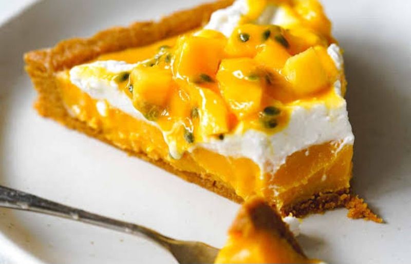 5.Top with whipped cream and if you want to decorate the tart, arrange the mango slices around the edge so they’re slightly overlapping, then scatter over the the coconut flakes and mint leaves, and spoon over the passion fruit pulp. Will keep chilled for up to three days.