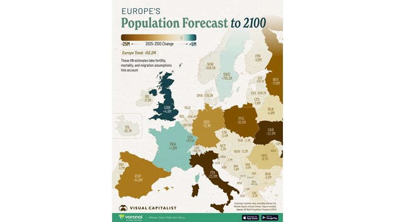 This map, via Visual Capitalist's Pallavi Rao, shows the projected change in population levels for every European country between now and the year 2100.