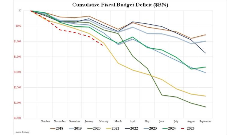 The difference between how much money the US brought in vs how much it spent, means that in March the US budget deficit was $161 billion. Which sounds like a lot (it is) until you realize that in February the deficit was almost twice as much, or $307 billion. And compared to the $236 billion deficit a year ago, 2025 was a solid 32% lower.