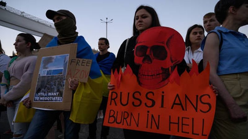 16 Mar 2025 CET RT: FILE PHOTO: A demonstrator is holding a placard depicting a skull that reads 'Russians burn in hell' in Warsaw, Poland. © Aleksander Kalka / NurPhoto via Getty Images