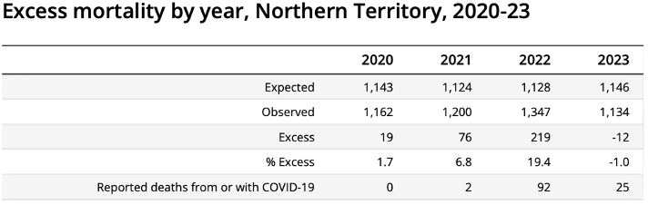 Four of Australia’s states and territories are the focus here. They all experienced excess deaths during the pandemic. I noticed that, no doubt partly because of the country’s relative isolation and natural oceanic borders, in the regions of Queensland, Western Australia, South Australia, and the Norther Territory, deaths from COVID-19 only became a (relatively) big deal from 2022 onwards. For example, there were no COVID-19 deaths in the NT in 2020, the crucial pandemic year before the vaccines arrived, and a whopping 2 COVID-19 deaths in 2021, comprising a very small proportion of overall excess deaths, with double digit COVID-19 deaths in the following years (see pic below). WA even saw COVID-19 deaths decrease from 2020 to 2021, to *zero*, before shooting up in 2022, when everyone was supposed to be ‘protected’ by the vaccines. Weird, huh?