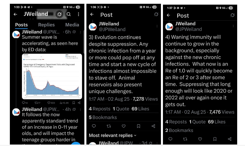 But nature, as always, has the last laugh — especially when humans attempt to intervene on a large scale in complex biological systems. That’s something these semi-literate soothsayers are now being forced to acknowledge — whether they like it or not. Weiland’s recent posts on X (see below) seem to reflect just that: an awkward recognition that the collective immune system has crumbled, viral spread is now unstoppable, and that even animal populations may now be turning into permanent reservoirs. But does he get why this is happening? Nope. He still writes nonsense like ‘evolution continues despite suppression’ — to which I’d suggest a more accurate version: ‘evolution continues because of (sustained) suboptimal suppression.’