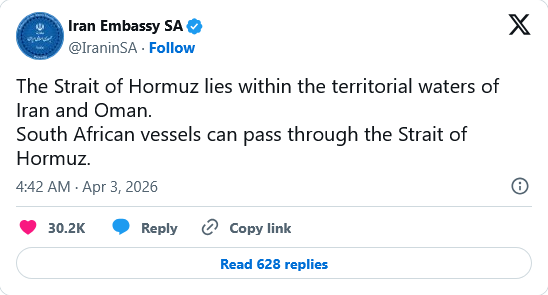 That was the message from the Iranian Embassy in South Africa as tensions in the Middle East continue to grip one of the world’s most critical oil chokepoints. The narrow waterway, where a significant share of global oil supply passes, has become a major point in the escalating standoff involving Iran, the United States and Israel.