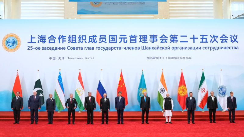 RT: Participants of the Shanghai Cooperation Organization (SCO) summit pose for photos at the Meijiang Convention and Exhibition Center in Tianjin, China, Sept. 1, 2025. © Suo Takekuma/Pool Photo via AP