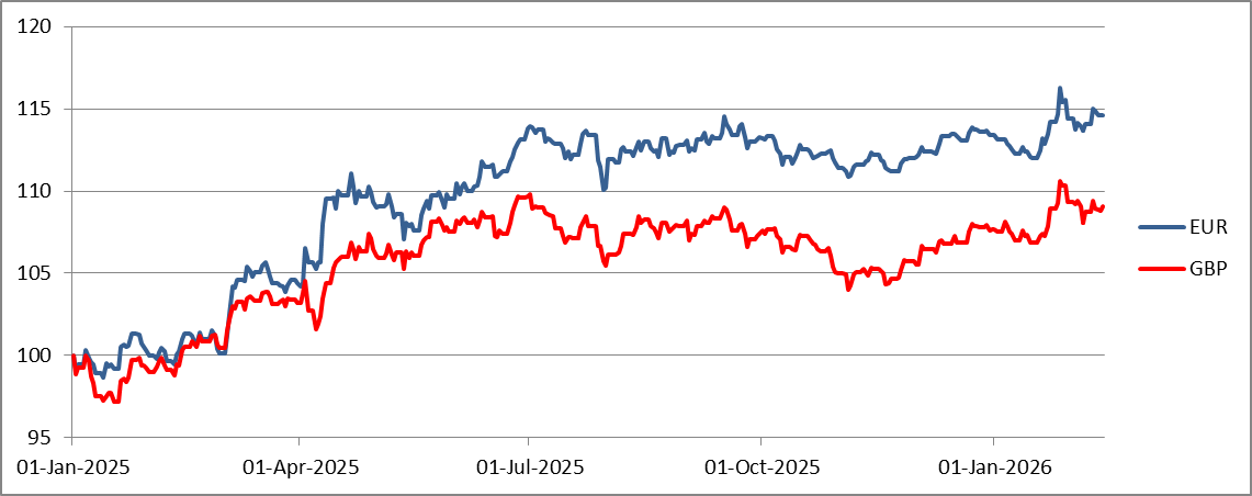 Basically from the day of President Trump’s inauguration, the US dollar peaked (the price of euro and pound hit a trough) and since then it has depreciated by around 15% against the euro, but only about 8% against the British pound.