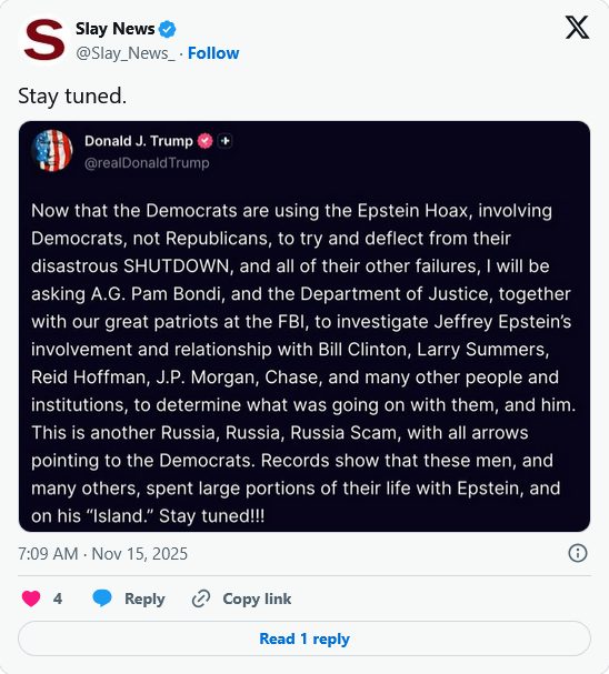 “Now that the Democrats are using the Epstein Hoax, involving Democrats, not Republicans, to try and deflect from their disastrous SHUTDOWN, and all of their other failures, I will be asking AG Pam Bondi, and the Department of Justice, together with our great patriots at the FBI, to investigate Jeffrey Epstein’s involvement and relationship with Bill Clinton, Larry Summers, Reid Hoffman, JPMorgan, Chase, and many other people and institutions, to determine what was going on with them, and him.”