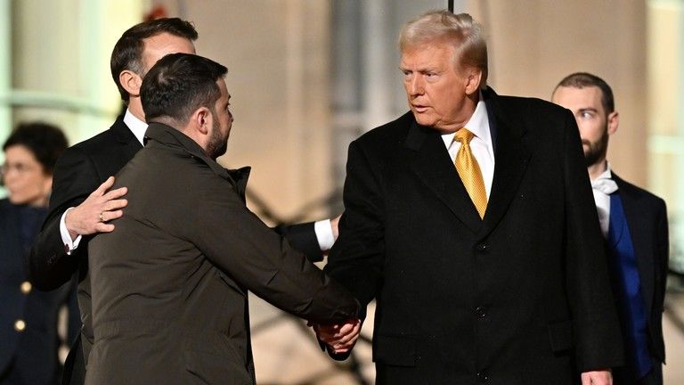 8 Dec 2024 CET RT: Vladimir Zelensky and Donald Trump leave after their meeting at the Elysee Palace in Paris, France on December 7, 2024. © Mustafa Yalcin / Anadolu via Getty Images