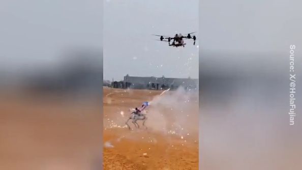 The UAV hovering about two meters (6.5 feet) above the ground is seen showering its opponent with fireworks attached to its landing gear. The robo-dog returns fire with pyrotechnics, while both machines constantly manoeuvre, apparently trying to avoid being hit.