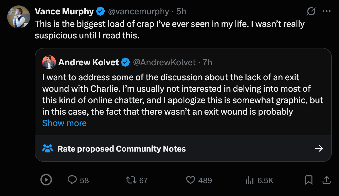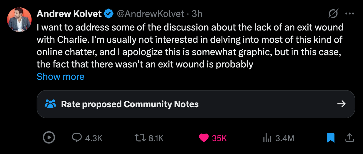 According to his statement on X, Kolvet said he spoke with the surgeon who treated Kirk at the hospital. The surgeon reportedly said the bullet “absolutely should have gone through [Kirk’s neck],” as that is typical for a high-velocity round of that caliber.