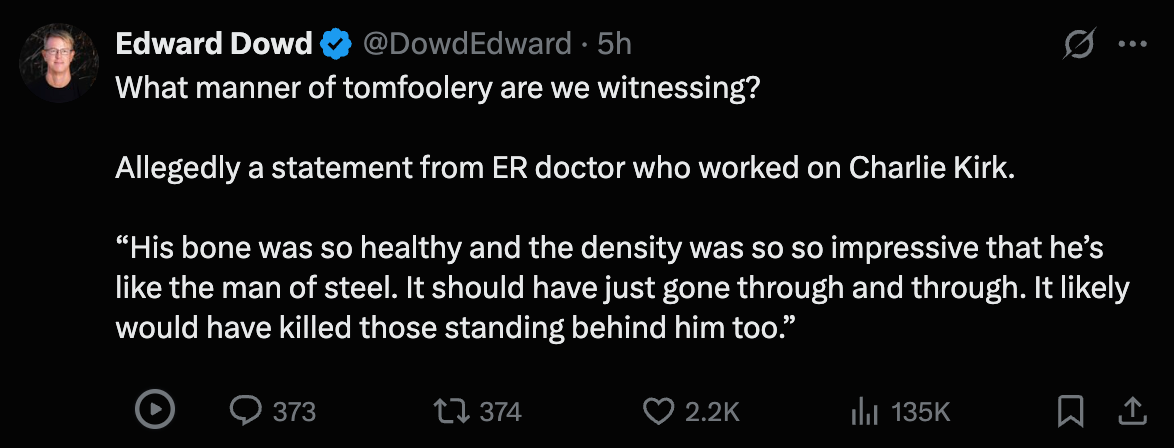 “I can’t believe this. The spokesperson for TPUSA just posted two hours ago that they talked to the coroner and that Charlie Kirk was shot with a .30-06 in the left side of his neck, the carotid artery. And that he’s a ‘man of steel’ and that the bones in his neck that are like chicken bones stopped a bullet that travels 2,500 ft per second out of the barrel… it probably hit him at 1,900 ft per second.”