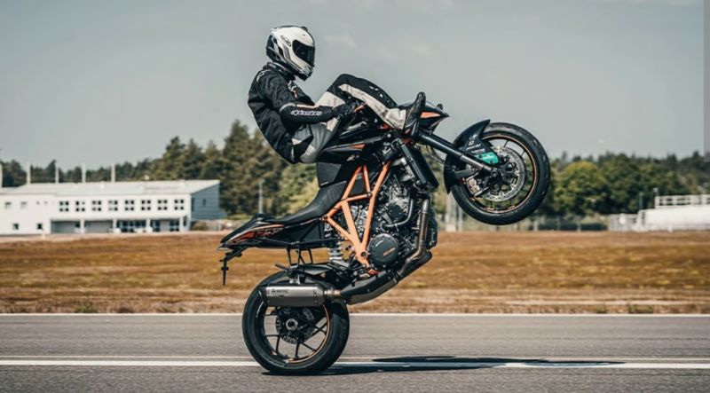 Carlsson picked the KTM 1290 Super Duke R as the bike for this feat – an apt choice indeed. It's a bike that is widely considered to be among the most insane naked bikes ever built. Its 1,301cc V-twin engine produces an absurd amount of power and torque – enough to lift the front end with the simplest of throttle pulls.